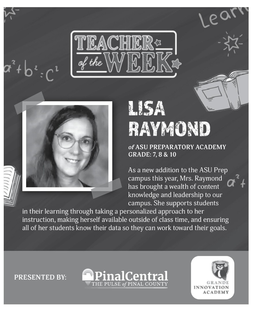 As a new addition to the ASU Prep campus this year, Mrs. Raymond has brought a wealth of content knowledge and leadership to our campus. She supports students in their learning through taking a personalized approach to her instruction, making herself available outside of class time, and ensuring all of her students know their data so they can work toward their goals.